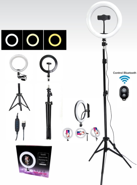 Aro de luz con función de ajuste de color y brillo. El control remoto Bluetooth facilita la toma de fotos o videos. El trípode alto brinda versatilidad en el ángulo de iluminación.
