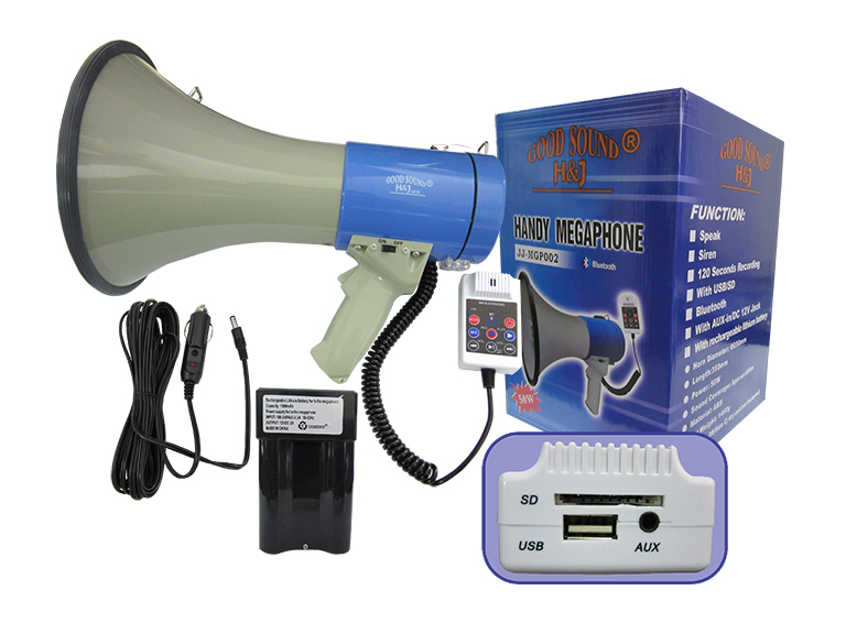 Megáfono marca Good Sound H&J con potencia de 50W, conectividad Bluetooth y batería recargable de 12V. Permite grabar mensajes y reproducirlos en alto volumen, ideal para eventos o convocatorias al aire libre.